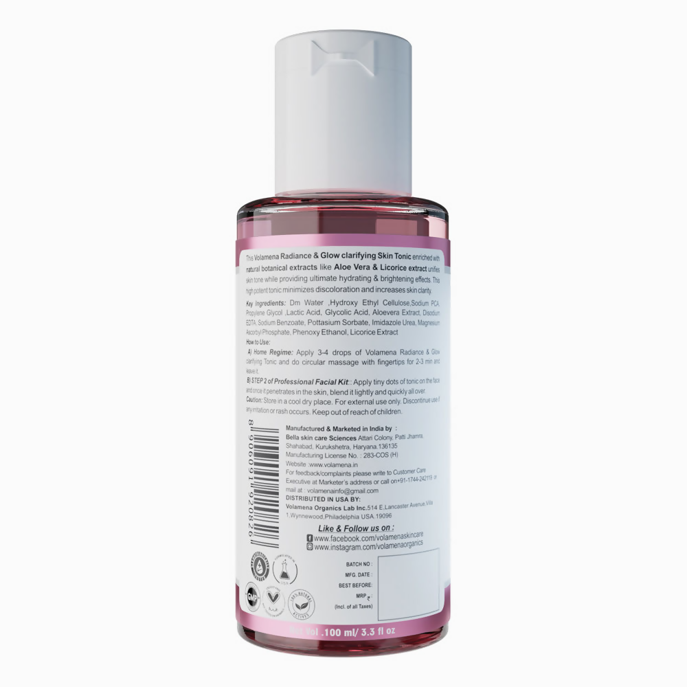 - Home Routine: Dispense 3-4 drops of Volamena Radiance & Glow Clarifying Tonic and gently massage in circular motions with your fingertips for 2-3 minutes, then leave it on.