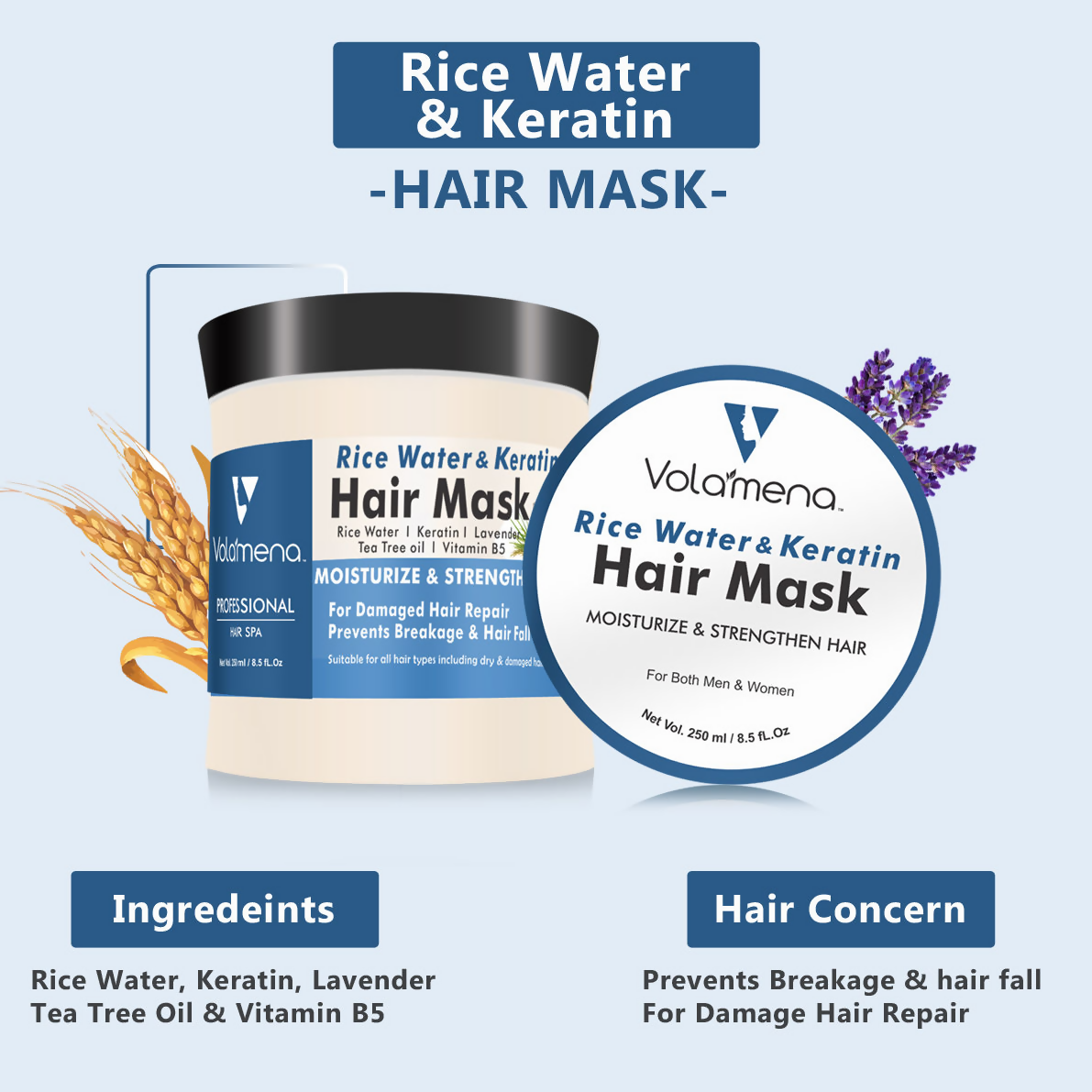About the Product:- Volamena Rice Water & Keratin Hair Mask, enriched with the beneficial properties of Rice Water and Tea Tree Essential Oil, aids in fortifying fragile, damaged hair, invigorating weak roots, enhancing luster, and soothing an irritated scalp. Rice Water Extract, abundant in antioxidants, amino acids, zinc, magnesium, and vitamins B & C, works to reinforce hair, rejuvenate brittle strands, and impart a smooth, glossy finish. Hydrolyzed Keratin Protein smooths rough cuticles, bolstering strength and sheen. Tea Tree Essential Oil, with its phytonutrients, invigorates the scalp and alleviates itchiness. Suitable for both men and women, this mask is ideal for regular use. Volamena Rice Water Shampoo is devoid of harmful chemicals such as phthalates, parabens, SLES, PEG, and artificial colors.