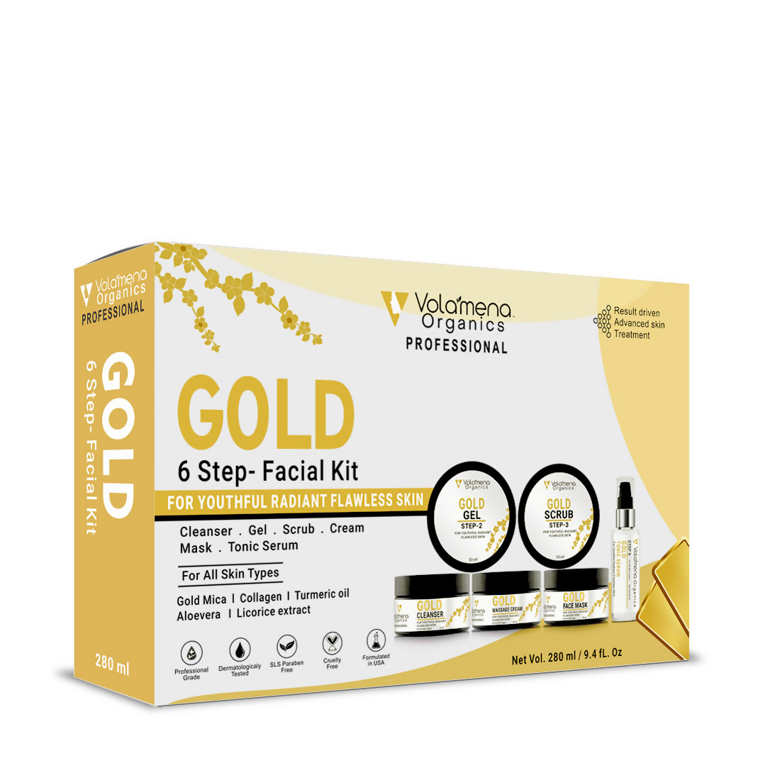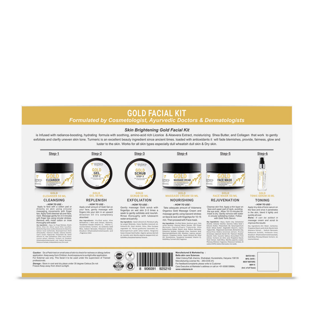 - Experience the Volamena Skin Brightening Gold Facial Kit, formulated with a luminous-enhancing, moisturizing blend enriched with calming, amino-acid rich Licorice & Aloe Vera Extract, hydrating Shea Butter, and Collagen. These ingredients gently exfoliate and even out skin tone. Turmeric, a renowned beauty element since ancient times, is packed with antioxidants to diminish blemishes, impart fairness, and bestow a radiant glow on your skin. Suitable for all skin types, particularly beneficial for lackluster wheatish and dry skin.