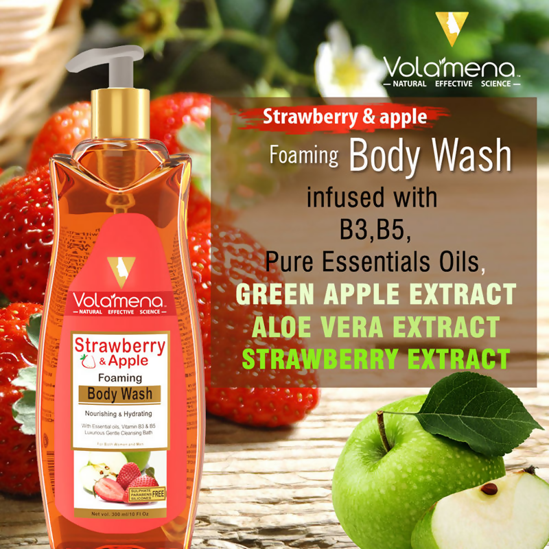 About the Product:- Start your day refreshed by releasing the luxurious foam of Volamena's Strawberry & Apple Foaming Body Wash. This enriching cleanser provides profound hydration while gently purifying your skin. Strawberry extract, abundant in vitamin C, boosts collagen synthesis and helps prevent the formation of wrinkles. Meanwhile, the vitamin-enriched green apple extract imparts a naturally radiant look, ensuring you feel invigorated all day long. Its delicate and soothing aroma relaxes both body and mind.