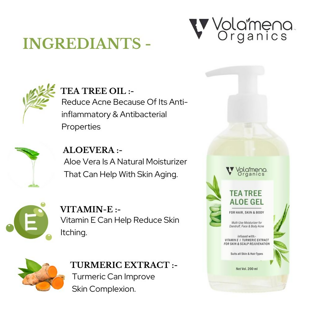 About the Product:- Volamena Organics Tea Tree Aloe Vera Gel addresses acne, blemishes, and dandruff. Its natural composition calms the scalp, fostering healthier and clearer skin and hair. Apply to the scalp to alleviate dandruff and soothe irritation. Its anti-inflammatory attributes ensure a healthy, flake-free scalp.