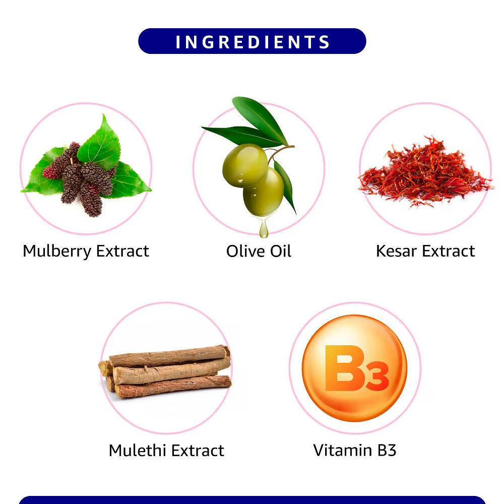 - Mulberry Extract, Olive, Kesar Extract, Mulethi Extract, Vitamin B3