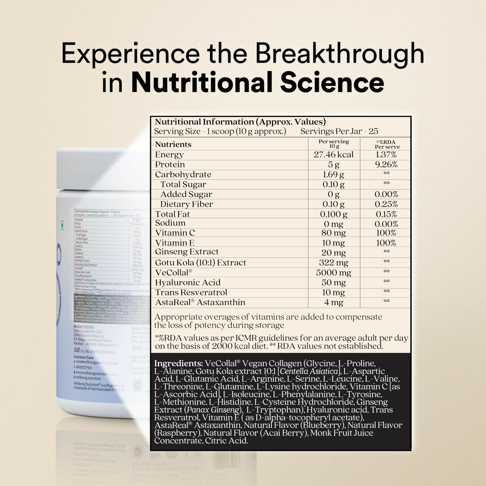 - UNIQUE VEGAN COLLAGEN SIMILAR TO HUMAN TYPE I COLLAGEN VeCollal is engineered to replicate human Type I collagen, accurately imitating the amino acid composition of collagen (all 18 amino acids) through a plant-based fermentation method. Fortified with Hyaluronic acid & two potent antioxidants, Natural Astaxanthin (as Astrareal) & Resveratrol, it enhances skin luminosity, supports fuller skin, and shields the skin from environmental aggressors.