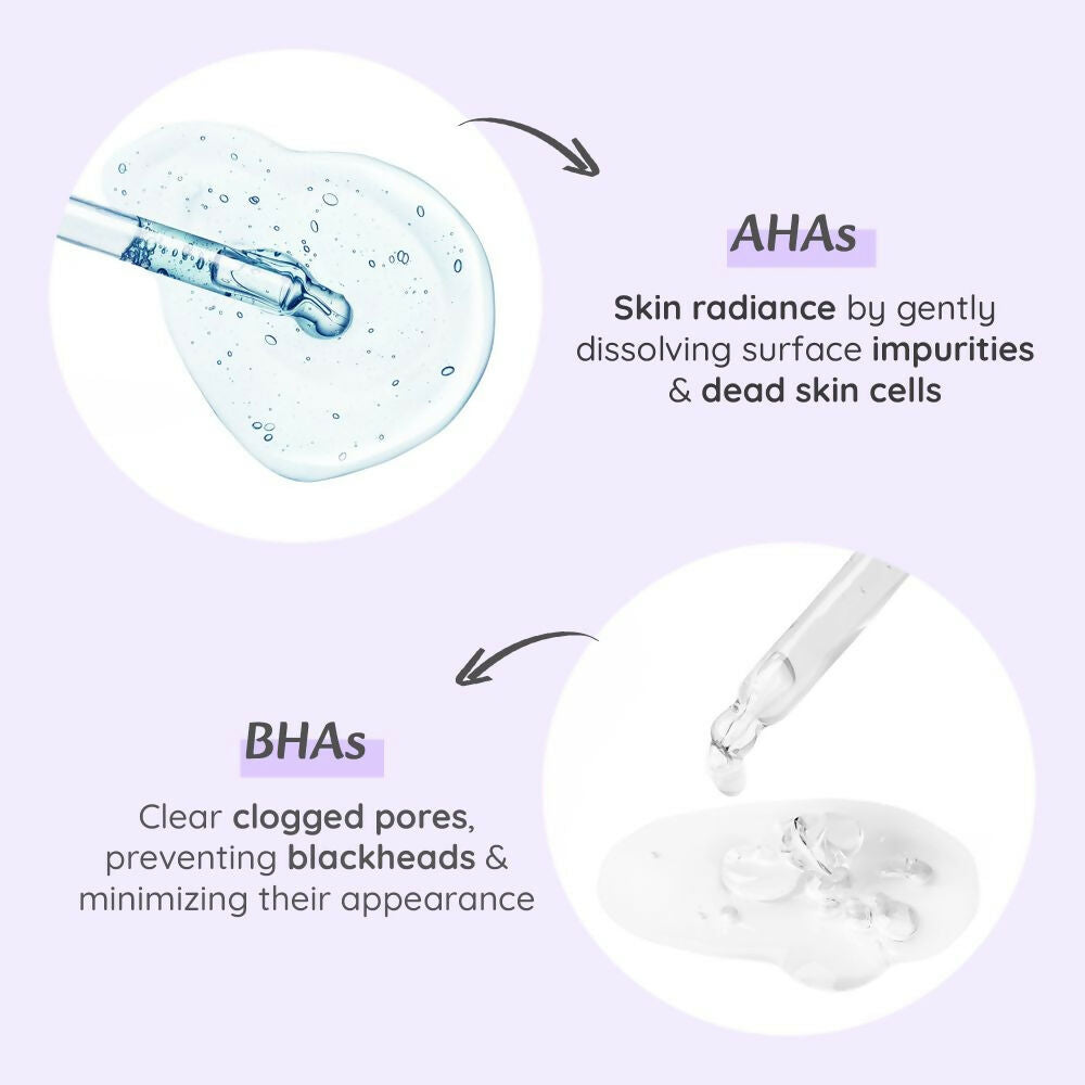 - Enhances Texture & Clarity: AHA aids in dissolving surface-level dead skin, refining texture, while BHA delves into pores to cleanse impurities and minimize acne flare-ups.