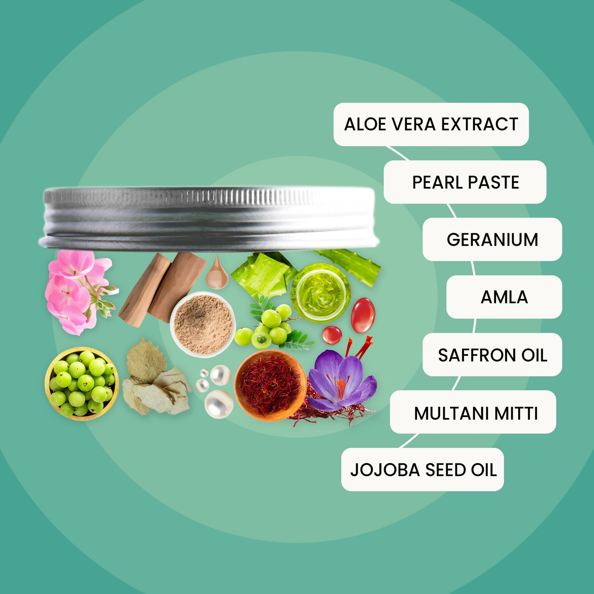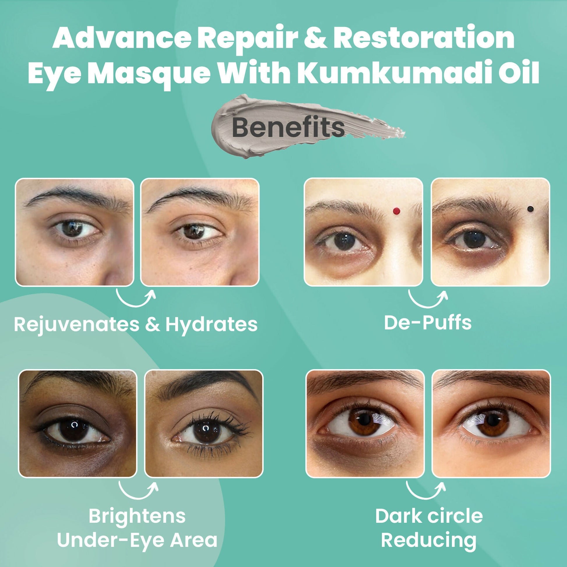 About the Product:The Inspiration behind this Product: The inception of the eye masque finds its roots in ancient Egypt, where beauty and skincare were of paramount importance. The legendary Nefertiti, celebrated for her stunning allure, was said to utilize natural components to preserve her youthful visage. Drawing from this ancient wisdom, our Advanced Repair and Restoration Eye Masque embodies the essence of Nefertiti's heritage. It is a fusion of natural ingredients such as Geranium, Sandalwood, Saffron Oil, Multani Mitti, Amla, and Aloe Vera Extract. This masque channels the ancient Egyptian traditions, delivering hydration, luminosity, and a reduction in puffiness, revitalizing the skin around the eyes, much like it might have during Nefertiti's era.