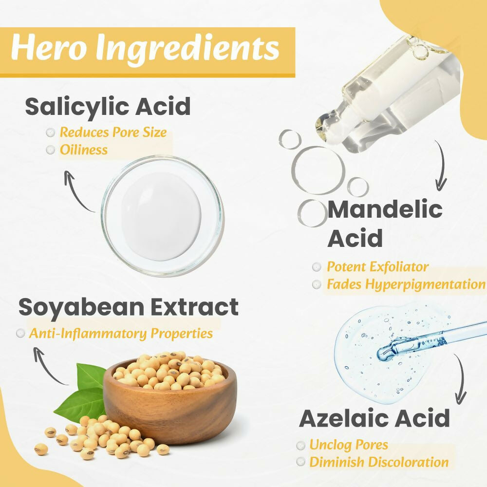 About the Product:- Potent Dual-Acid Blend: Integrates Salicylic Acid (2%) and Mandelic Acid (2%) to combat acne, clear pores, and gently exfoliate for a more luminous and refined complexion.