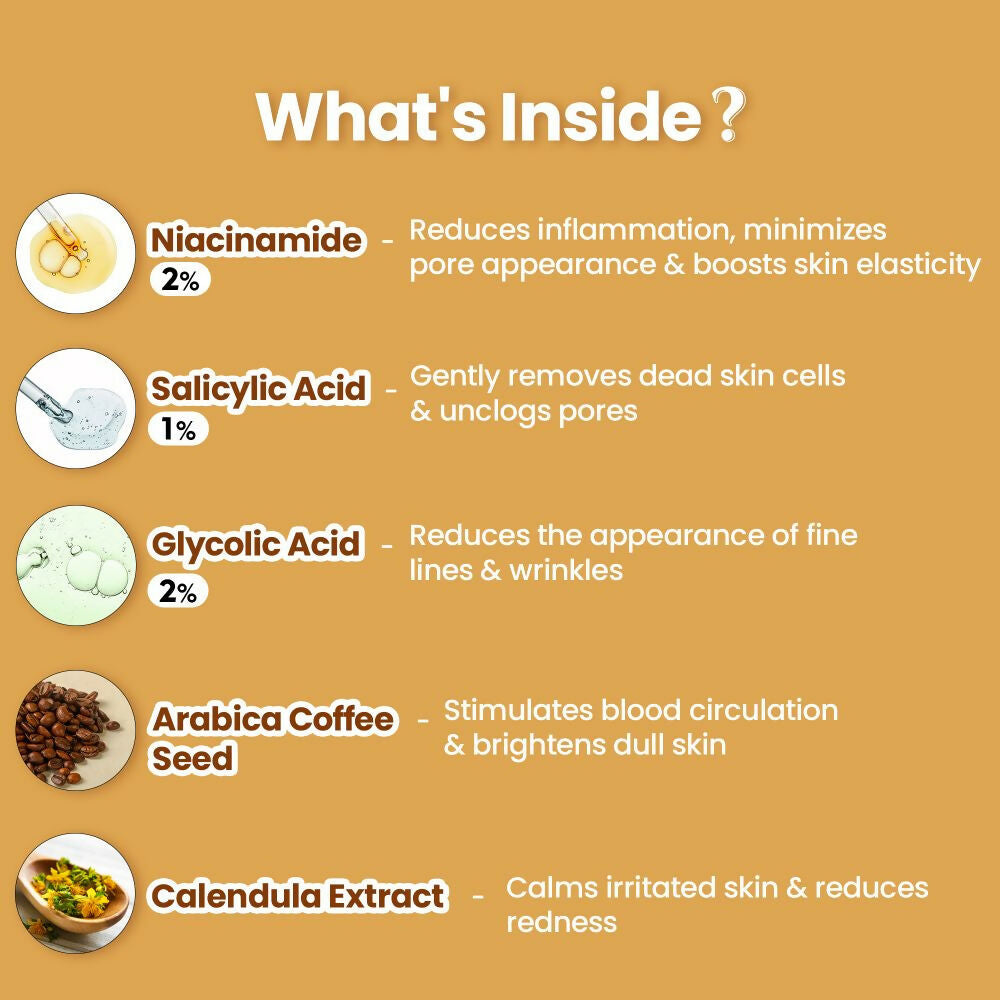 - 1. 1% Salicylic Acid: A powerful exfoliant, Salicylic Acid in our facewash gently eliminates dead skin cells, unclogs pores, and combats acne for a clearer complexion.