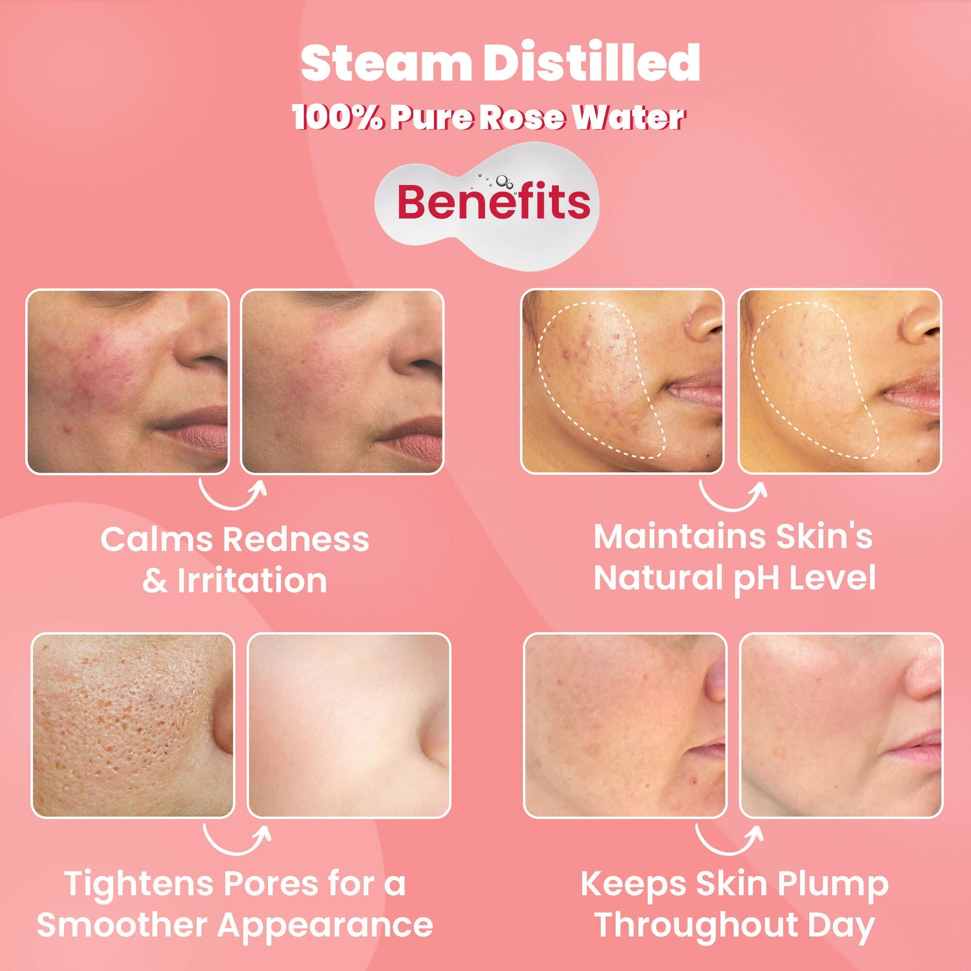 - Indulge your skin with our completely pure and rejuvenating rose water! Crafted by steaming freshly picked Damask roses at the peak of their fragrance, this mist revitalizes, moisturizes, and tones your complexion. It's akin to a refreshing splash for your face, leaving it velvety, well-balanced, and with the delightful scent of a rose garden!