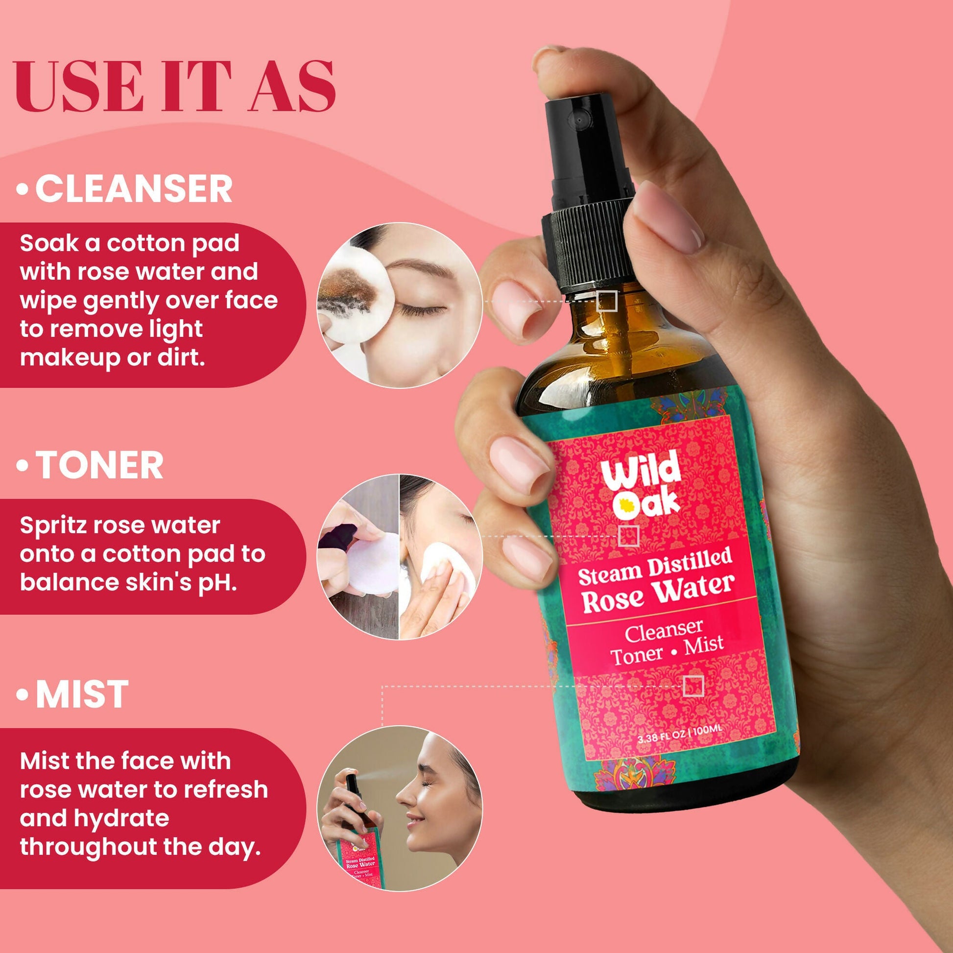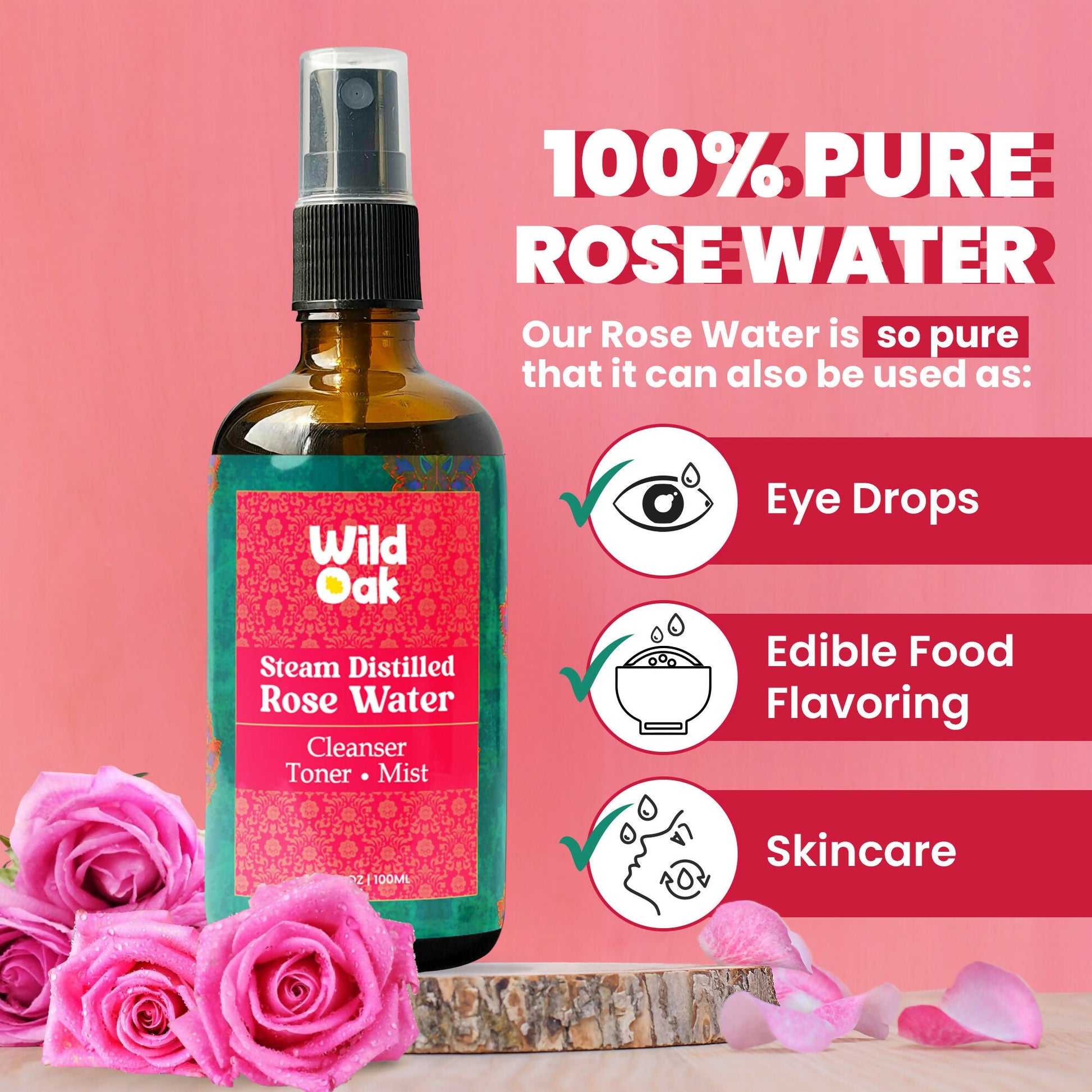 Wild Oak Steam Distilled 100% Pure Bulgarian Rose Water Face Toner