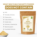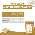 Wild Organic Multani Mitti is an entirely natural and exquisite gift from nature for both skin and hair. It helps maintain the skin's pH balance and provides essential moisture. Rich in calcium and silicates, it aids in diminishing dark spots, minimizing wrinkles and fine lines, enhancing skin brightness, clearing clogged pores, drying out acne, and imparting a radiant glow. Multani mitti is also beneficial for hair care. When used for hair washing, it nourishes and hydrates, reducing split ends, frizz, and brittleness.