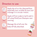 - Hair: Massage the oil into your scalp, allow it to sit for an hour, and then rinse out with a gentle WishCare shampoo.