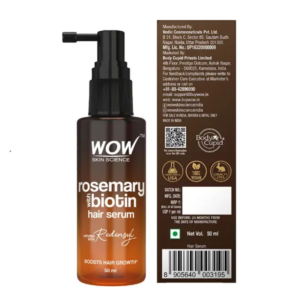 Revitalize your fragile, delicate hair and invigorate your dormant scalp with WOW Skin Science Rosemary with Biotin Hair Serum. This featherweight serum is expertly crafted with a distinct blend of rosemary oil, biotin, and redensyl. These botanical ingredients collaborate seamlessly to strengthen your hair strands, boost circulation to the roots, and add volume to your tresses.