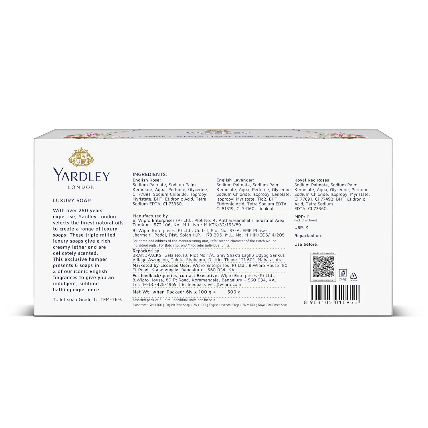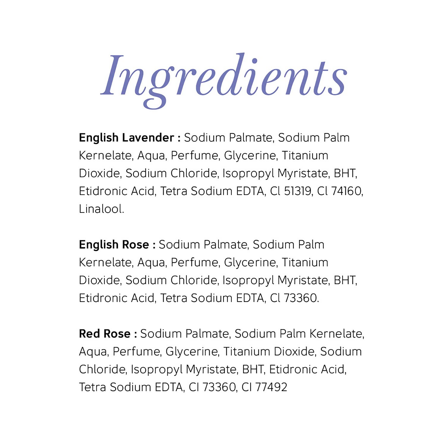 Discover the Yardley London Luxury Soap Collection, featuring the exquisite English Lavender, English Rose, and Royal Red Roses varieties. Transform your everyday bathing ritual into a regal indulgence with the English Lavender soap, which leaves your skin velvety smooth thanks to its calming lavender oils. The English Rose soap transports you to a realm of sophistication, infusing your routine with the opulence of English roses and a rich, creamy lather. For those who adore a hint of romance, the Royal Red Roses soap offers an alluring tale in a bar, with a captivating aroma of royal red roses that is both floral and warm.Ingredients: